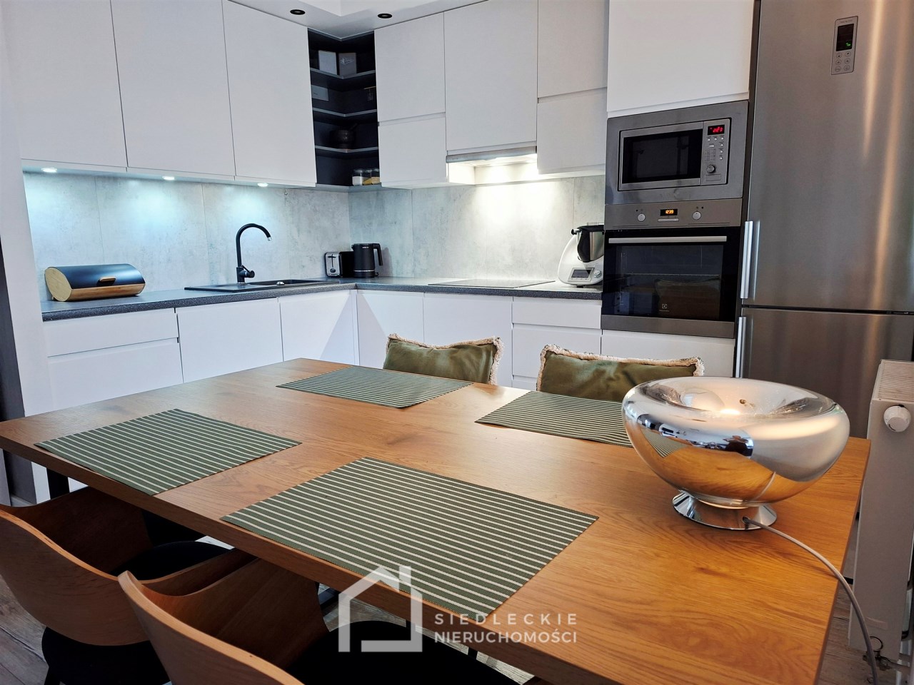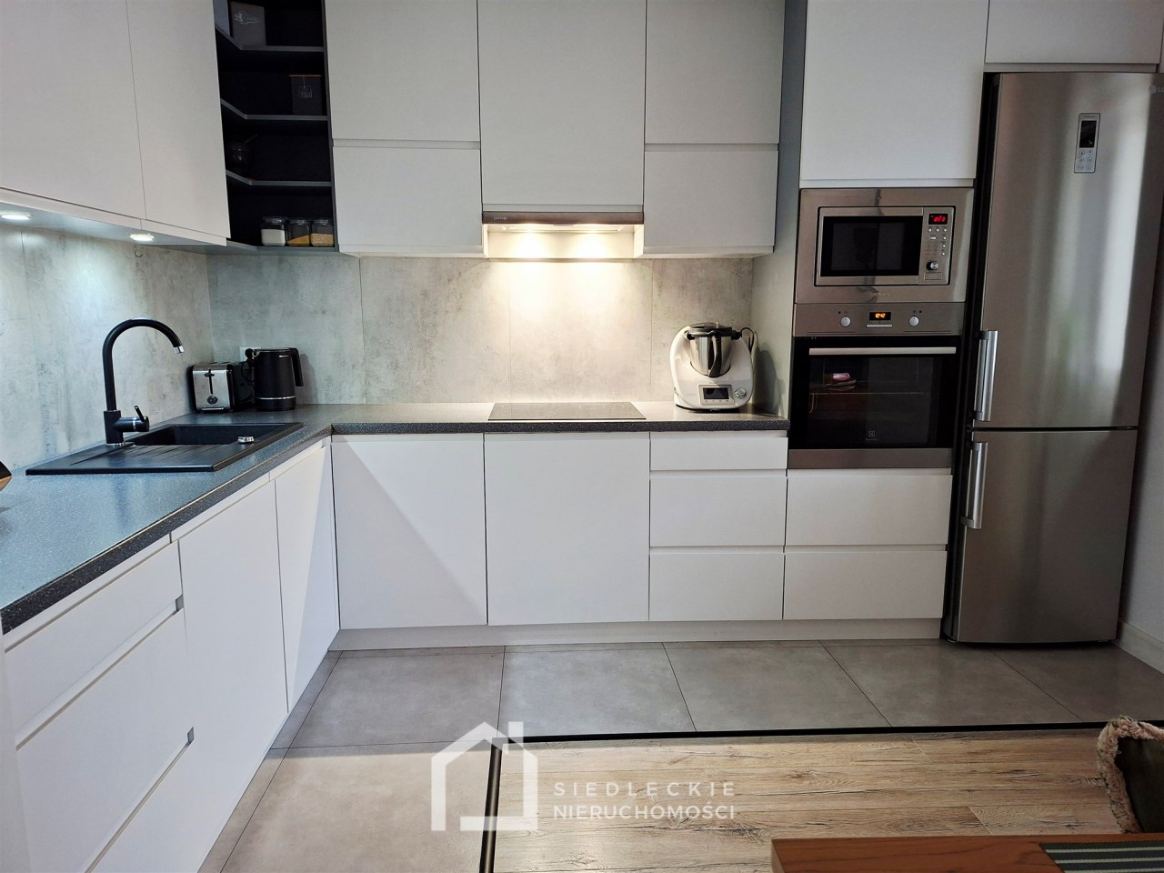 Kuchnia z meblami w zabudowie jest wyposażona w sprzęt AGD – płytę indukcyjną, piekarnik, lodówkę, zmywarkę oraz okap.