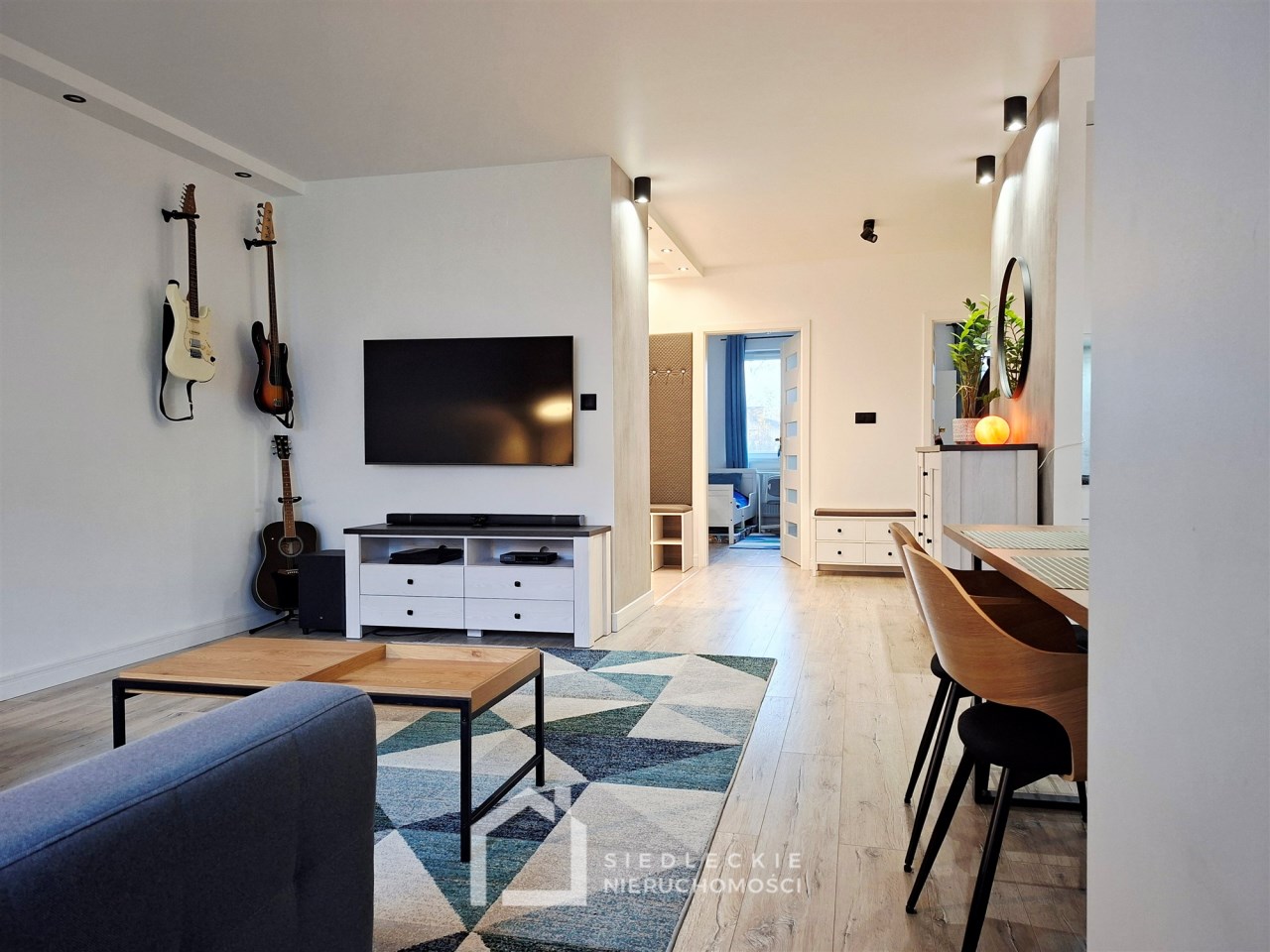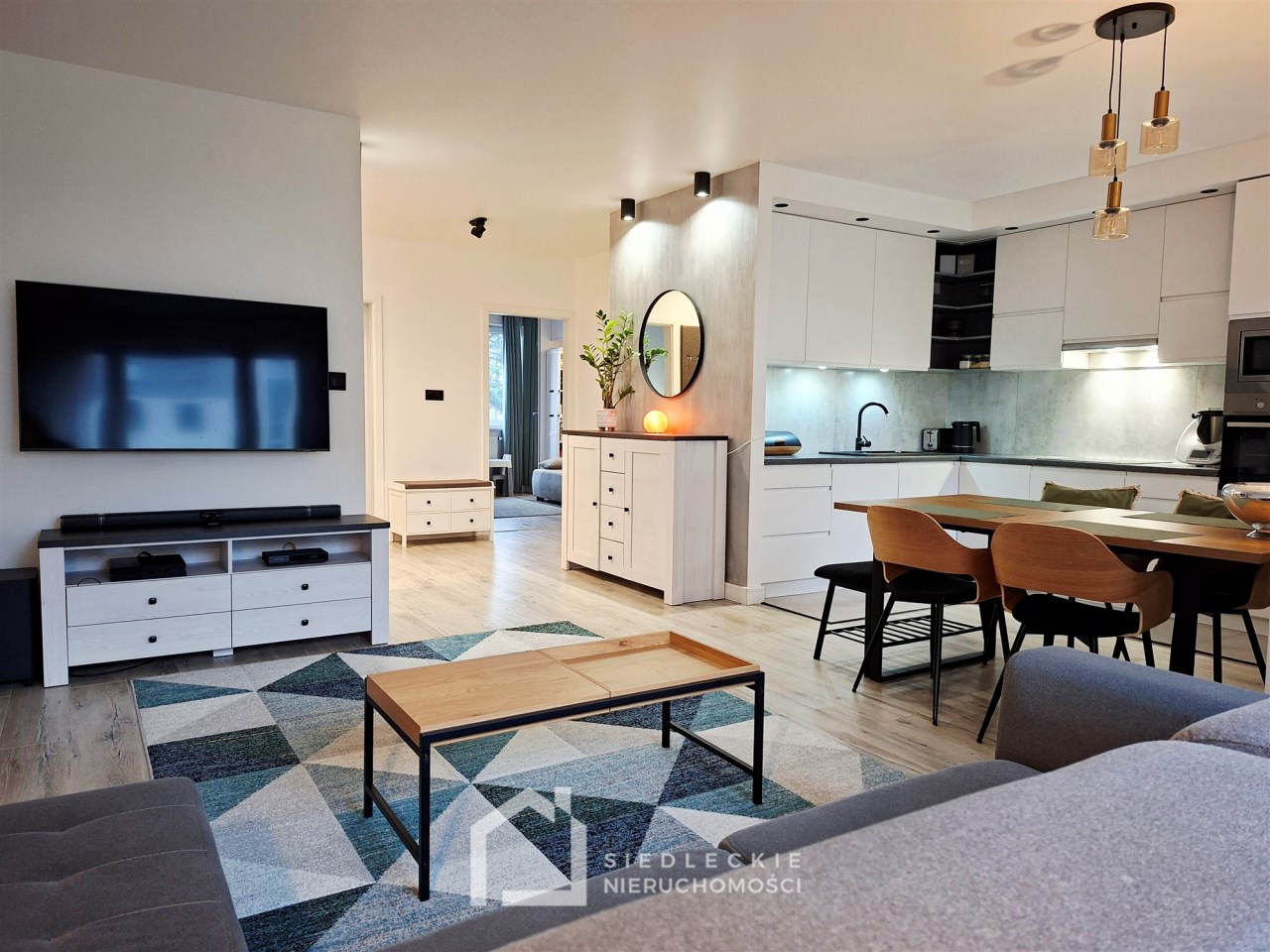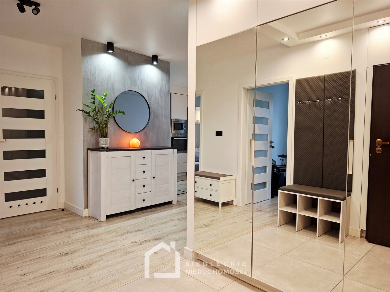 Na całej powierzchni lokalu jest dokładnie wszystko, co jest potrzebne do komfortowego mieszkania. Znajdziemy tu salon połączony z aneksem kuchennym, dwie ustawne sypialnie, duży korytarz z szafą wykonaną na wymiar, przestronną łazienkę z pralką oraz suszarką schowaną w zabudowie z dodatkowym miejscem do przechowywania.